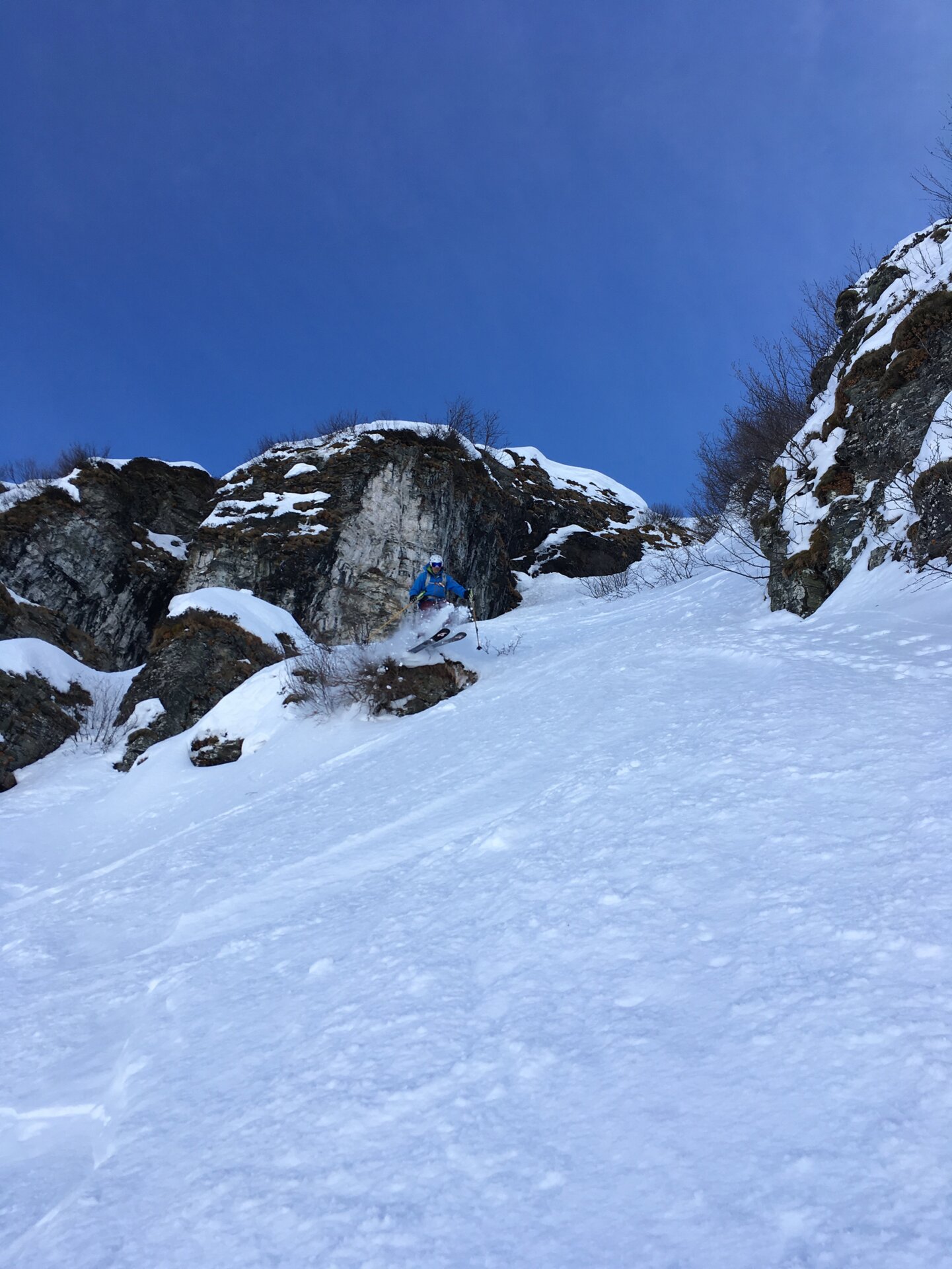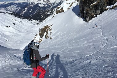 Hierzu müssen wir den Einstieg nicht lange suchen, denn Teile der Abfahrt sieht man schon vom Aufstieg aus. Je nachdem wie die Schneelage es zulässt, fahren wir vom Gipfel erst ein paar Meter zurück in östliche Richtung (entlang der steilen Aufstiegsspur), um dann in die breiten Hänge Richtung Nord-Osten einzufahren. Oft findet sich hier auch ein paar Tage nach dem letzten Schneefall noch Pulver. An der nächsten Geländekante überlegen wir, welchen Weg wir für die Steilstufe am Ende wählen. Weiter links ist die Ausfahrt zwischen den Felsen breiter, bei schlechter Schneelage jedoch sehr mit Büschen durchsetzt. Weiter rechts geht es durch eine Art Rinne weiter, aber die bekommt manchmal etwas Sonne ab. Dieses Jahr ist das keine Frage, wir haben mehr als genug Schnee, also links. Ein paar Schwünge später werden wir noch mal mit einem breiten Tiefschneehang verwöhnt, der wie die Rinne im Novatal auf die Schwarzköpfle Route trifft.
