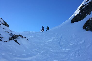 Noch ist es hier kalt und schattig, aber die wärmende Sonne ist nur wenige Schritte entfernt. Also verstauen wir auch unsere Jacken im Rucksack. Einen LVS Check später ziehen wir in Richtung der Lawinengalerie auf der rechten Seite los, dann um die „Ecke“, wo die Sonne schon auf uns wartet. Nach ein paar Minuten erreichen wir eine Wechte in der Einsattelung, die je nach Winter mehr oder weniger ausgebildet ist. Ab hier halten wir uns links und überwinden eine längere Steilstufe mit ein paar Spitzkehren. Bei frischem Schnee kommt man auch mal ohne aus. Dabei behalten wir unsere Umgebung gut im Blick, denn nicht selten kann man hier Gämse und Steinböcke in ihrer natürlichen Umgebung beobachten.