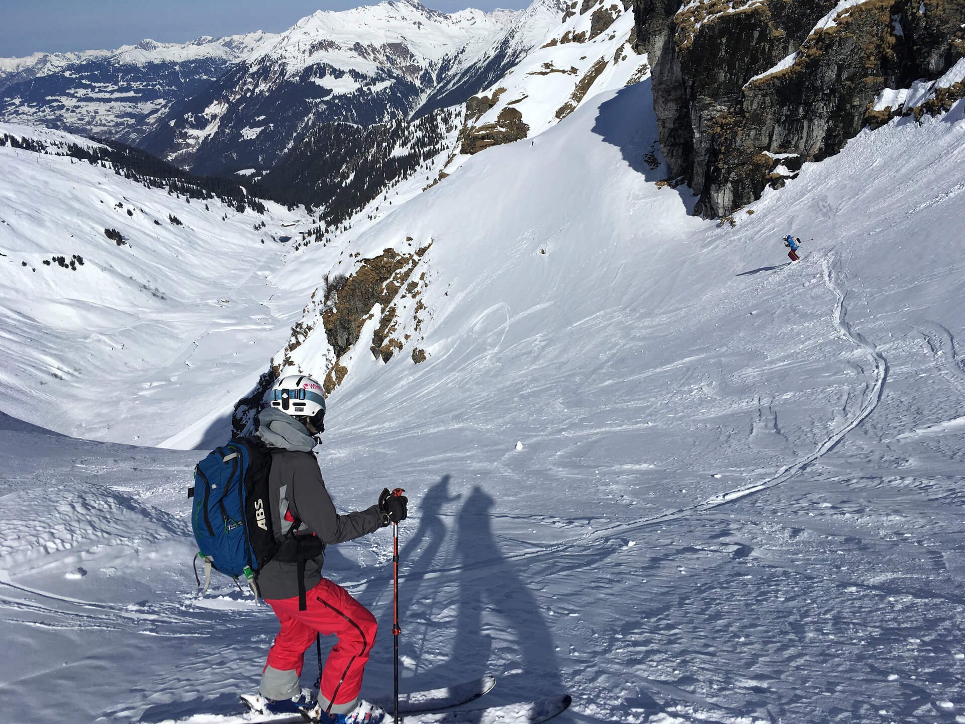 Den Einstieg dazu mussten wir beim ersten Mal regelrecht suchen. Auf der Karte sah es fast aus, als könnte man die Stelle nicht befahren (alles über 40 Grad und mehr). Von oben war aber schnell klar, wo es lang geht. Wir fahren zuerst ein paar Höhenmeter in nord-westliche Richtung ab (hier bitte nicht stürzen) und stehen dann auch schon mit gehörig Respekt am super steilen Einstieg der Nordrinne. Flitzeaufgeregt wagen wir uns langsam hinein und werden dann Schwung für Schwung im engen Couloir mutiger. Adrenalin pumpt durch unsere Adern. Nach etwa einem Drittel wird die Rinne deutlich breiter, bleibt aber noch steil. Spätestens in der Mitte brennen unsere Oberschenkel und wir schnaufen wie Glen Plake und Scot Schmidt im Ski Film Klassiker „Blizzards of Aahhhs“. Das ist alles egal, weil wir überglücklich sind, es bis dahin geschafft zu haben. Das Couloir läuft breit im Novatal aus und wir müssen nur noch durch die Felsblöcke hinaus navigieren und über die Schwarzköpfle Skiroute zurück zum Lift fahren.