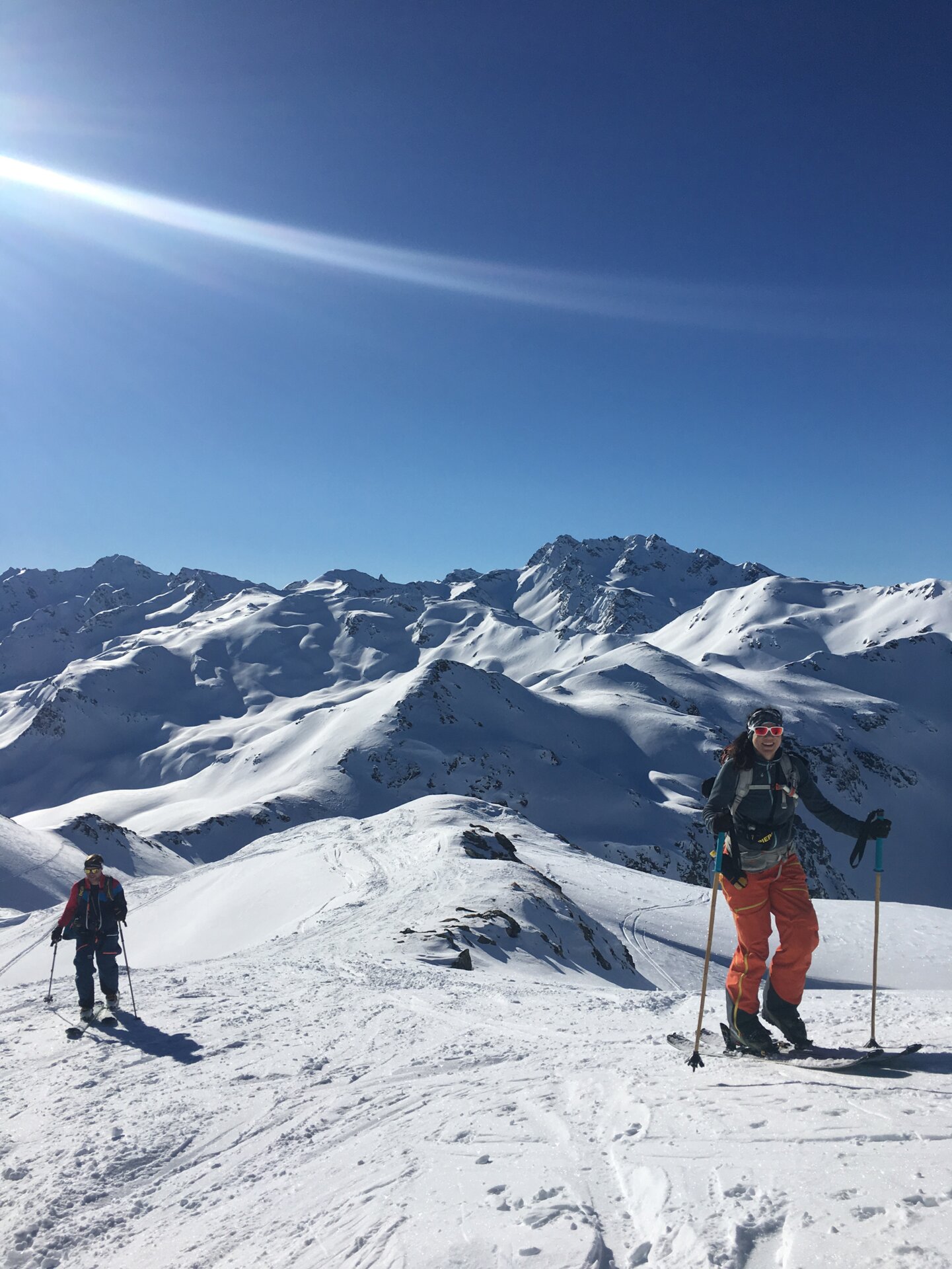 Oben angekommen gibt es erstmal eine leckere Jause mit Sura Kees Pistenbrot und Bergkräuter Tee. Den Gipfelschnaps lassen wir ehrlich gesagt weg, aber wer ihn mag, darf sich am Kreuz natürlich ein Schlückchen gönnen. Wir nutzen die Pause und inspizieren die verschiedenen Abfahrtsvarianten zwischen denen wir uns entscheiden müssen: nord-westlich ab durch die Mulde (>35 Grad steil), süd-westlich im großen Bogen (super bei Firn, >30 Grad steil) und nördlich die Direttissima durch eine Rinne (>40 Grad steil, verlangt absolut sichere Bedingungen und verzeiht keine Fehler). Alle drei enden mehr oder weniger am Nova Lift im Novatal. Wir sind sie alle schon mehrfach gefahren und natürlich favorisieren wir schon vor Tourbeginn eine Abfahrt, aber manchmal ändern sich die Bedingungen unterwegs oder das Bauchgefühl und wir entscheiden uns um, gehen eventuell einen Schritt zurück.