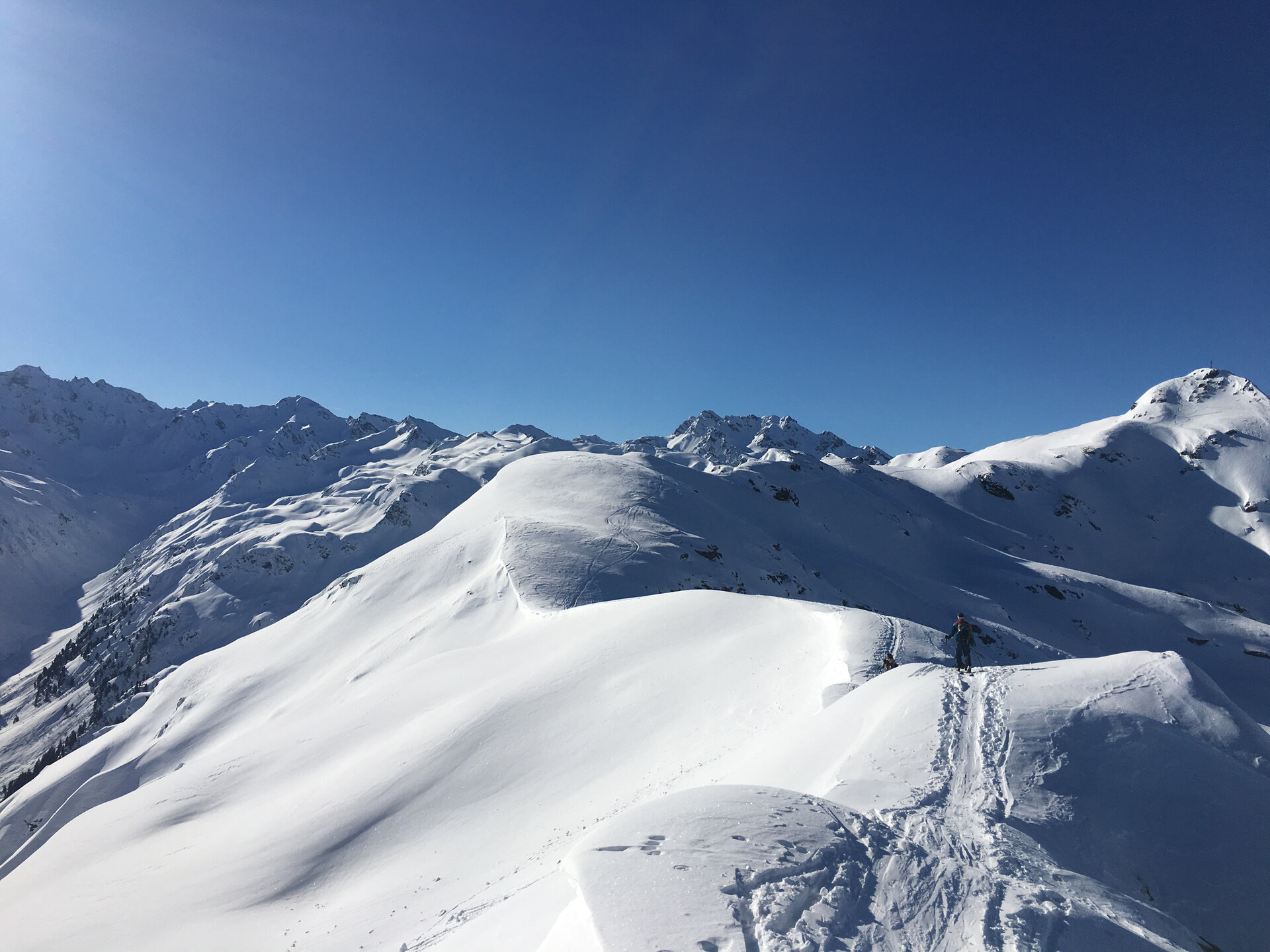 Im Anschluss an den Hang sehen wir mehr oder weniger schon den Rest der Strecke bis zum Gipfelkreuz vor uns liegen. Jetzt beginnt die lange Gratwanderung mit traumhafter Aussicht auf die zahllosen Gipfel der Westsilvretta. Der entspannte Weg entlang der Versettla führt uns mal etwas hinauf, dann hinunter (mit Fellen nicht ganz so lustig), wieder hinauf...