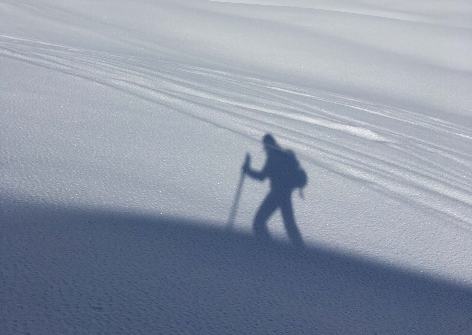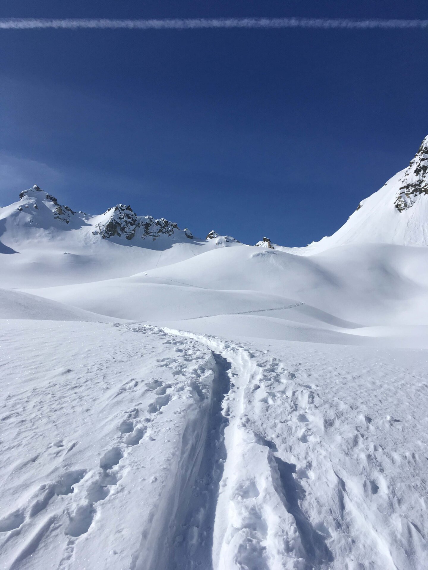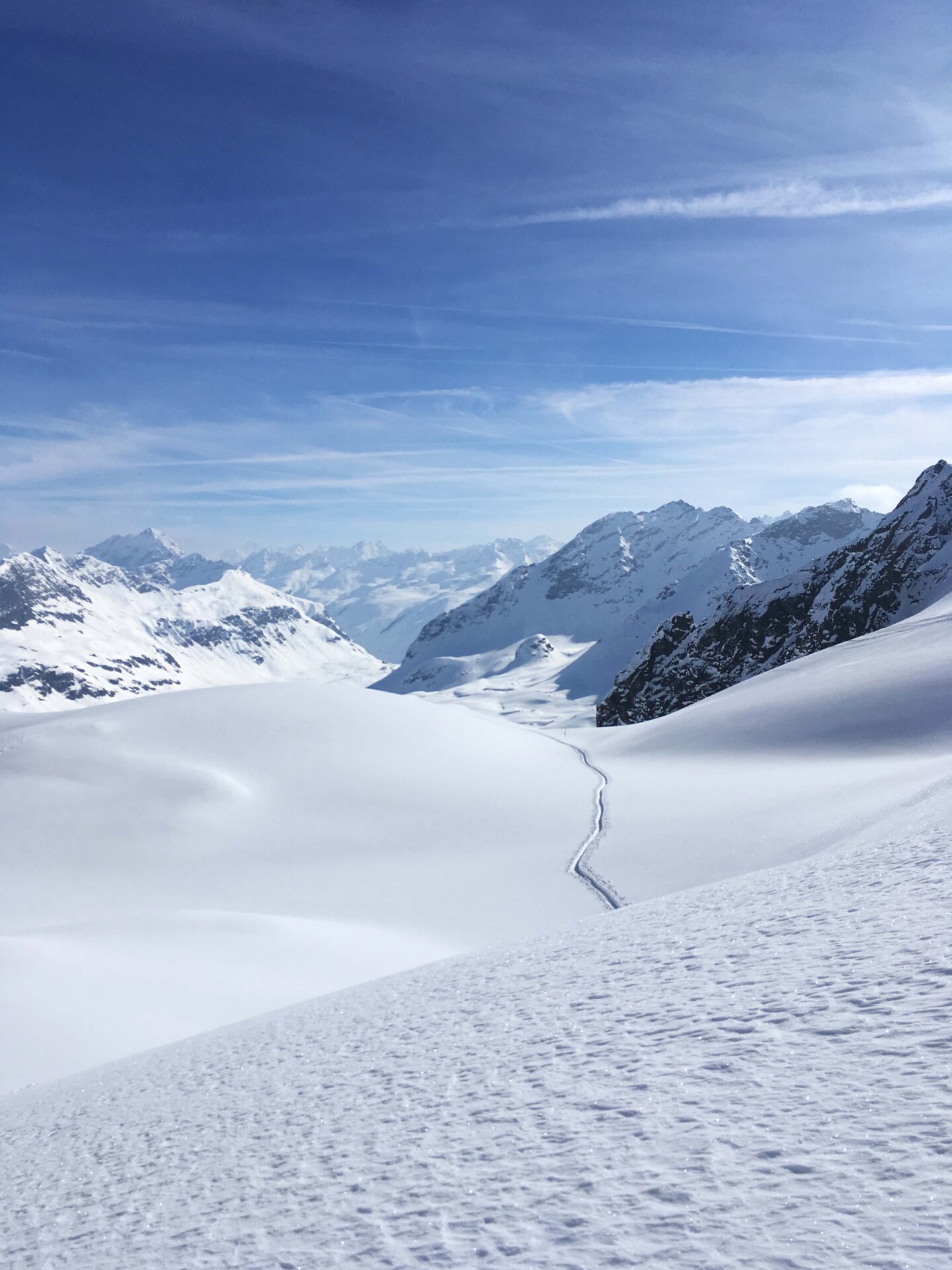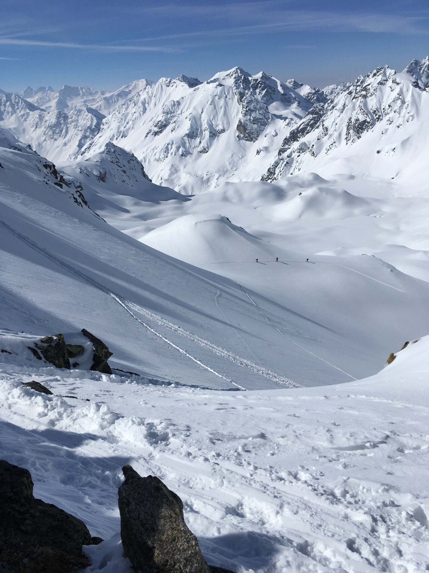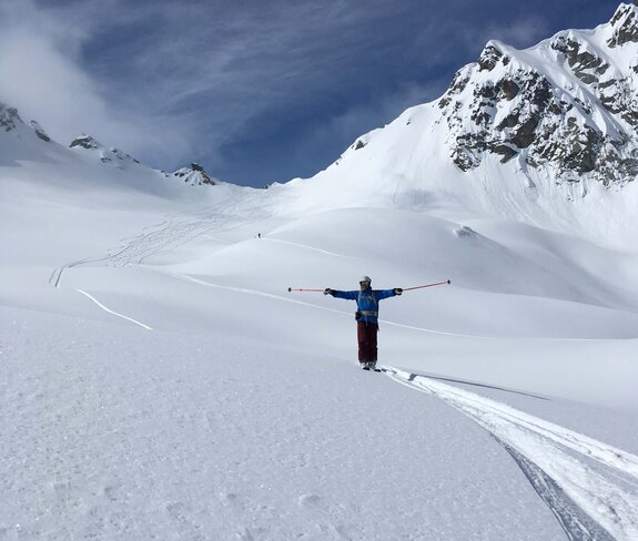 Auf die Jungs musste ich übrigens nicht allzu lange warten: sie erreichten die Lücke und das wild hopsende und winkende Begrüßungskommando von der Schweizer Seite aus etwa 20 Minuten später. Danach war ich erst recht glücklich: Denn so meditativ es sein mag, einen Aufstieg alleine zu machen, so langweilig ist es, alleine abzufahren. Und so wurde die gemeinsame Abfahrt im größtenteils unverspurten Pulver zur perfekten Belohnung. Denn geteilte Skifreude ist doppelte Skifreude, nicht wahr?
