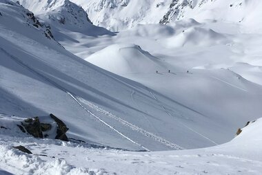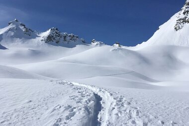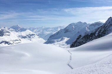 Ich hatte schon länger einen Blick auf diese Tour zum Schweizer Gletscher geworfen. Dass es meine erste „fast“ Soloskitour wurde, war ein Zufall. Mein Mann Dirk war an dem Wochenende nämlich beim Back on Track Contest (www.bot-freeride.at) auf der Saarbrücker Hütte und wollte am letzten Tag von dort mit ein paar Jungs zum Abschluss eine Skitour zur Schweizer Lücke machen. Also dachte ich mir, ich nutze das traumhafte Kaiserwetter mit perfekten Schneebedingungen und treffe ihn einfach oben.