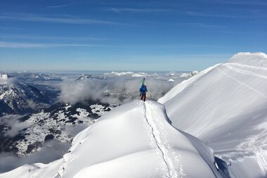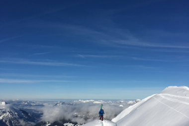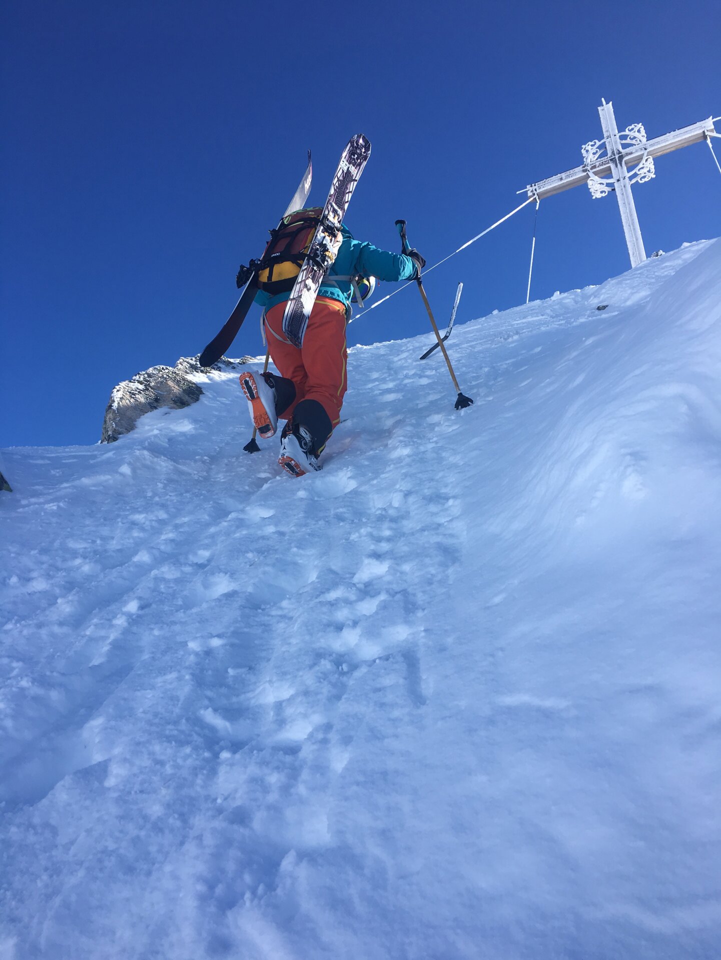 Die Hälfte konnten wir schiebend überwinden, doch an einem Punkt mussten wir dann die Ski am Rucksack festmachen und zu Fuß weiter laufen. Am Ende der Strecke gab es fürs Abenteuerfeeling noch eine kleine Kletterei am Drahtseil. Schwupps, die letzten Meter hoch zum Kreuz und der anstrengende Teil war geschafft.