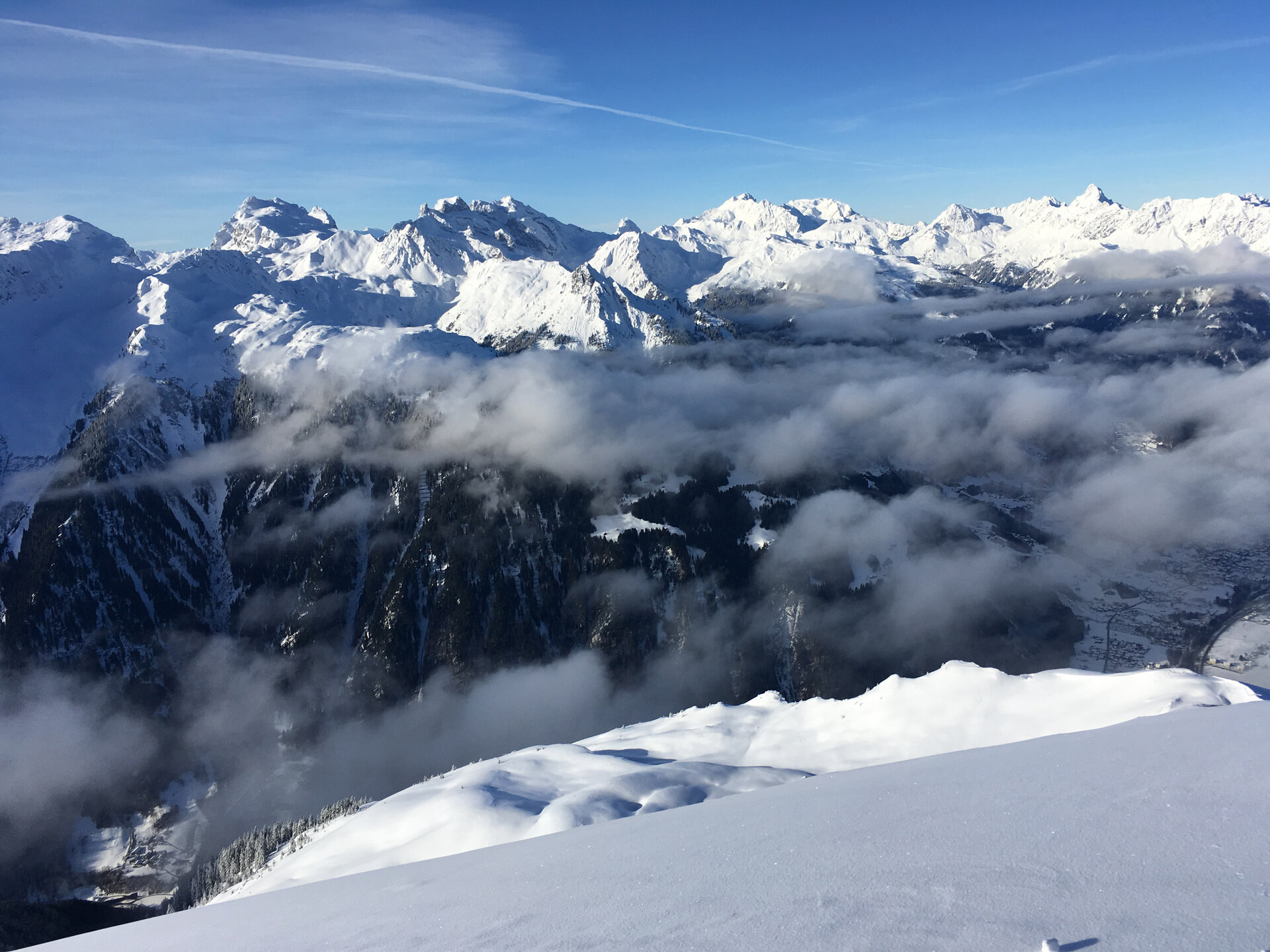 Unser Startpunkt war die Bergstation der Panoramabahn im Skigebiet Silvretta Montafon. Von dort brauchte es eine kurze aber beherzte Schussfahrt den Gegenhang hoch bis zur Skiroute Nr. 11 „Zamang“. Wir wollen hier gar nicht erst von einem Aufstieg sprechen, weil die zu überwindende Strecke über den Grat nur etwa 400 bis 500 Meter lang ist.