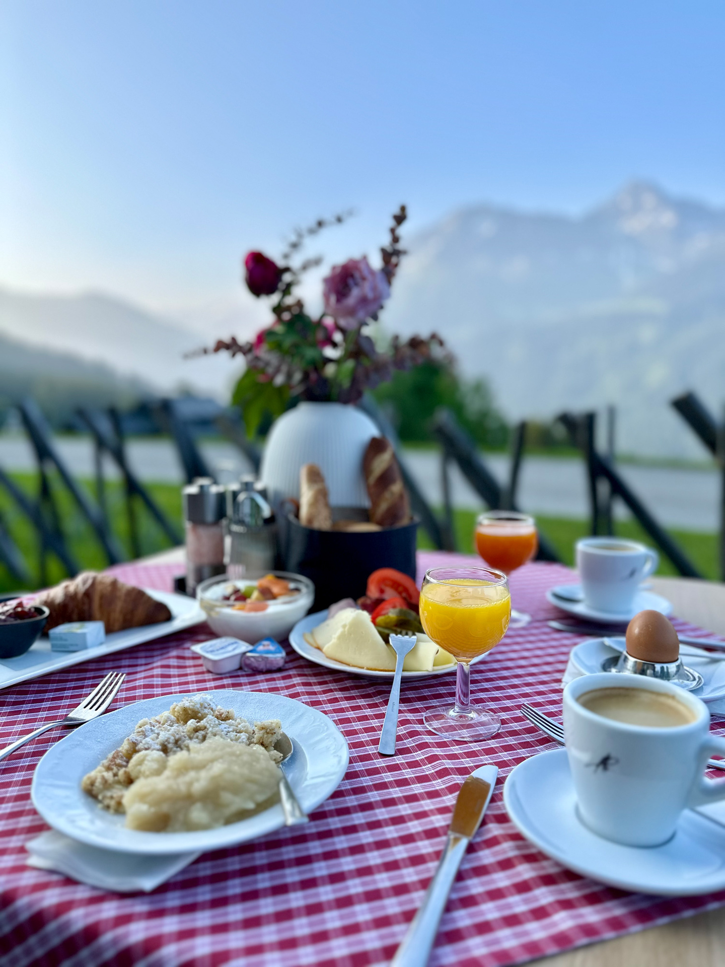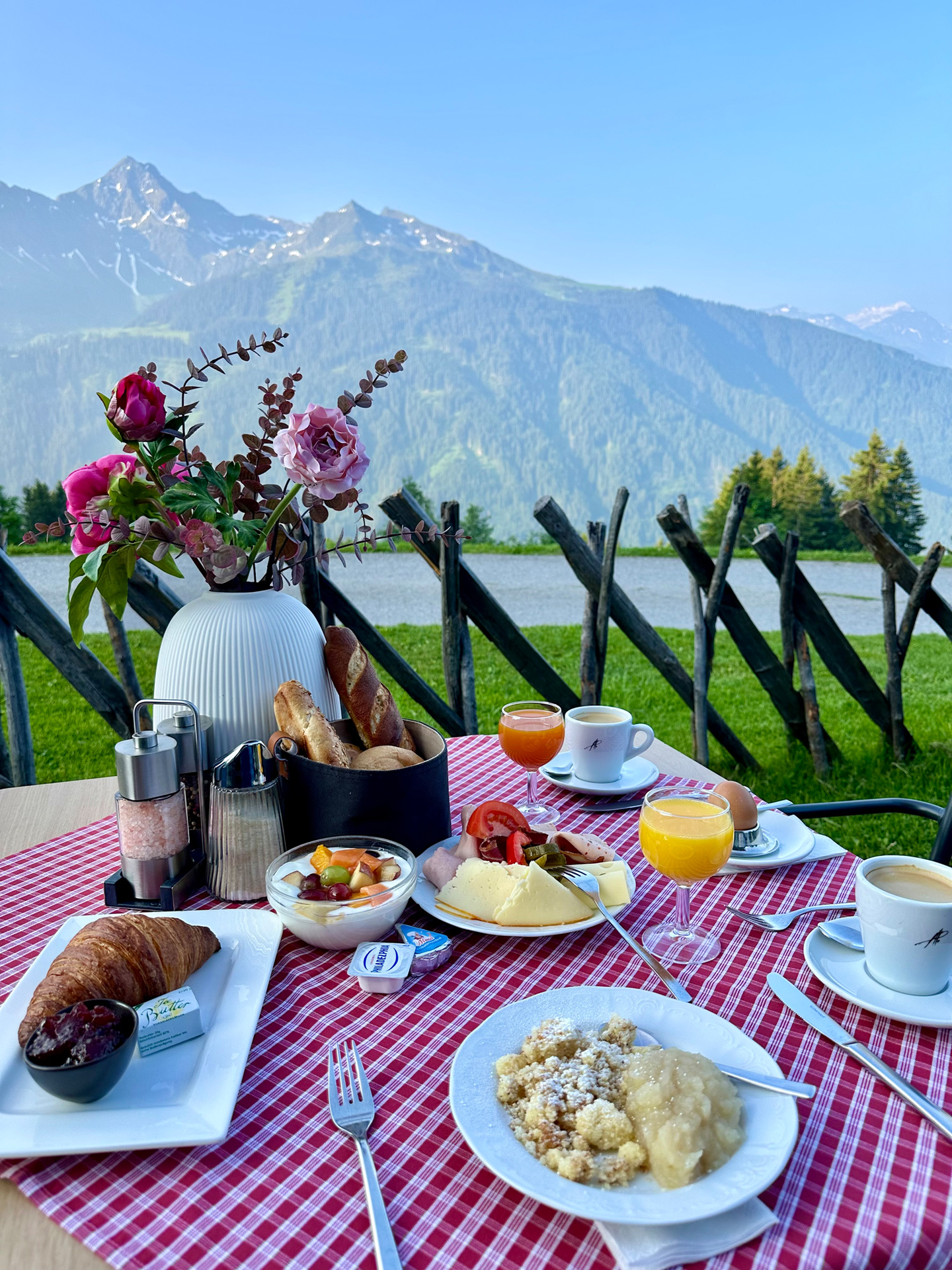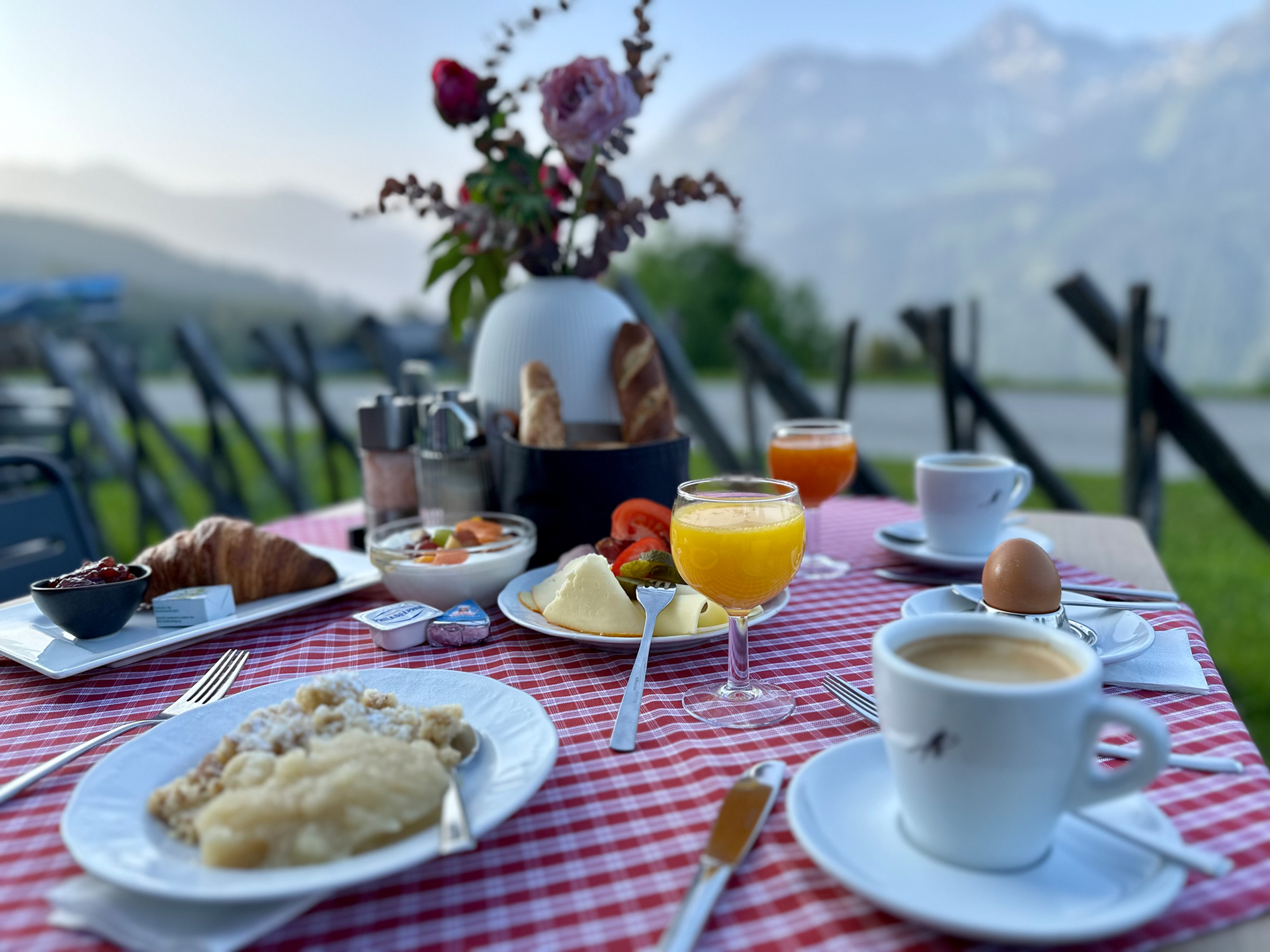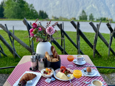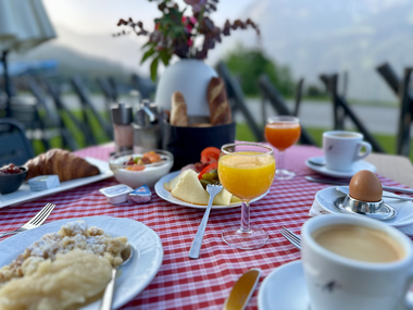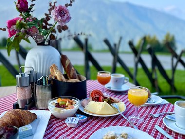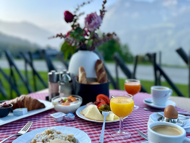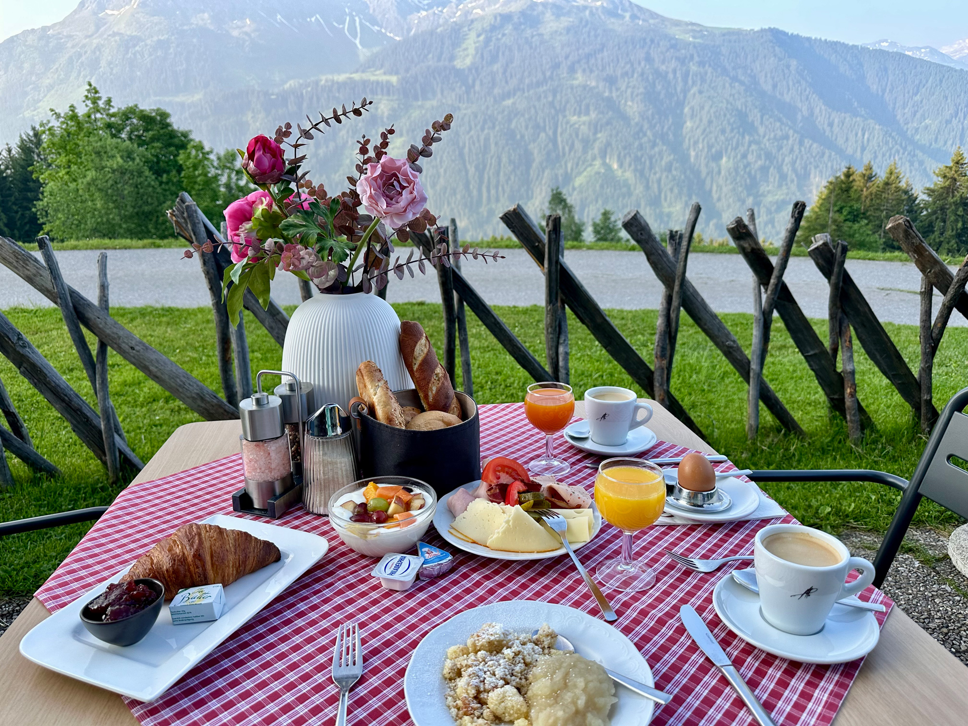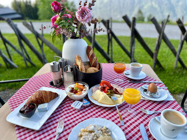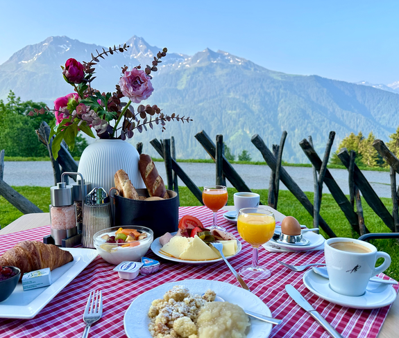 After prior registration (T. +43 5556 72290 or email), the “Montafon mountain breakfast at the Kristberg” in the old Montafon style (Montafon sura kees, Brösel (crumbs), bacon, fresh milk and butter, ...) can be booked daily from 8.00 am to 10.00 am. In sunny and dry weather, this takes place on the terrace of Panoramagasthof Kristberg with a wonderful view of the Rätikon and Verwall mountain ranges. In cold weather, the pleasant tables in our pub offer the right ambiance, panoramic view included.