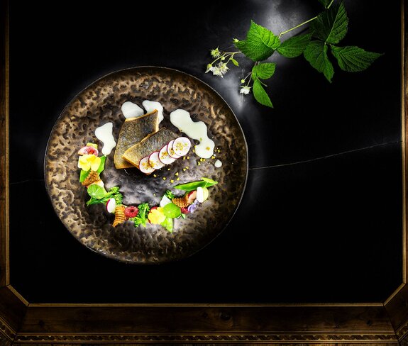 Saiblingsfilet mit Bärlauch-Erdäpfelpüree und glacierten Himbeer-Radieschen