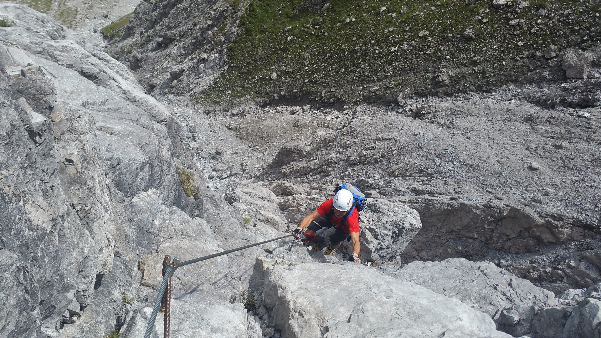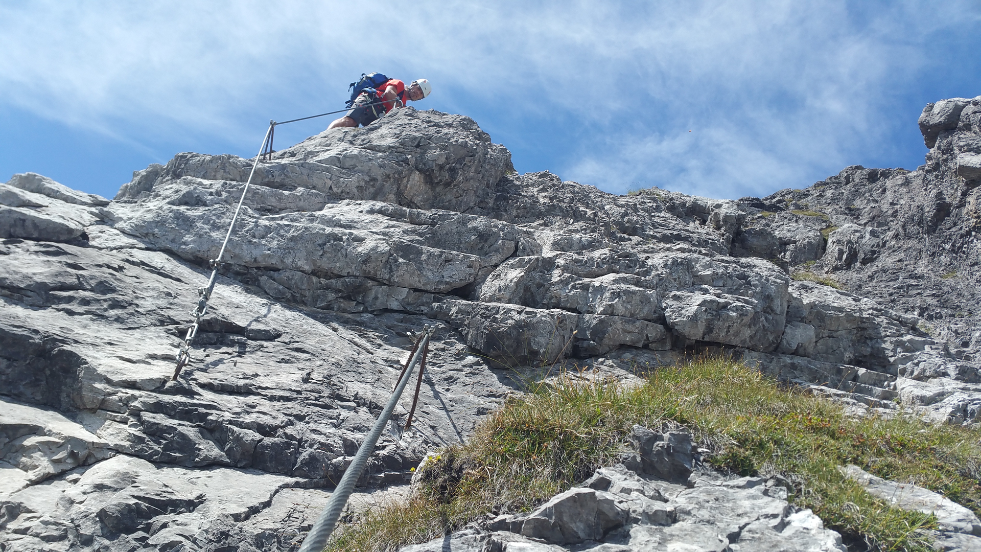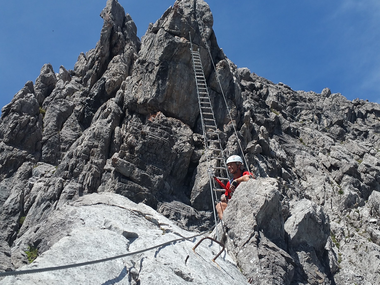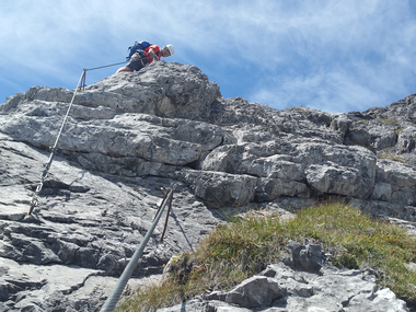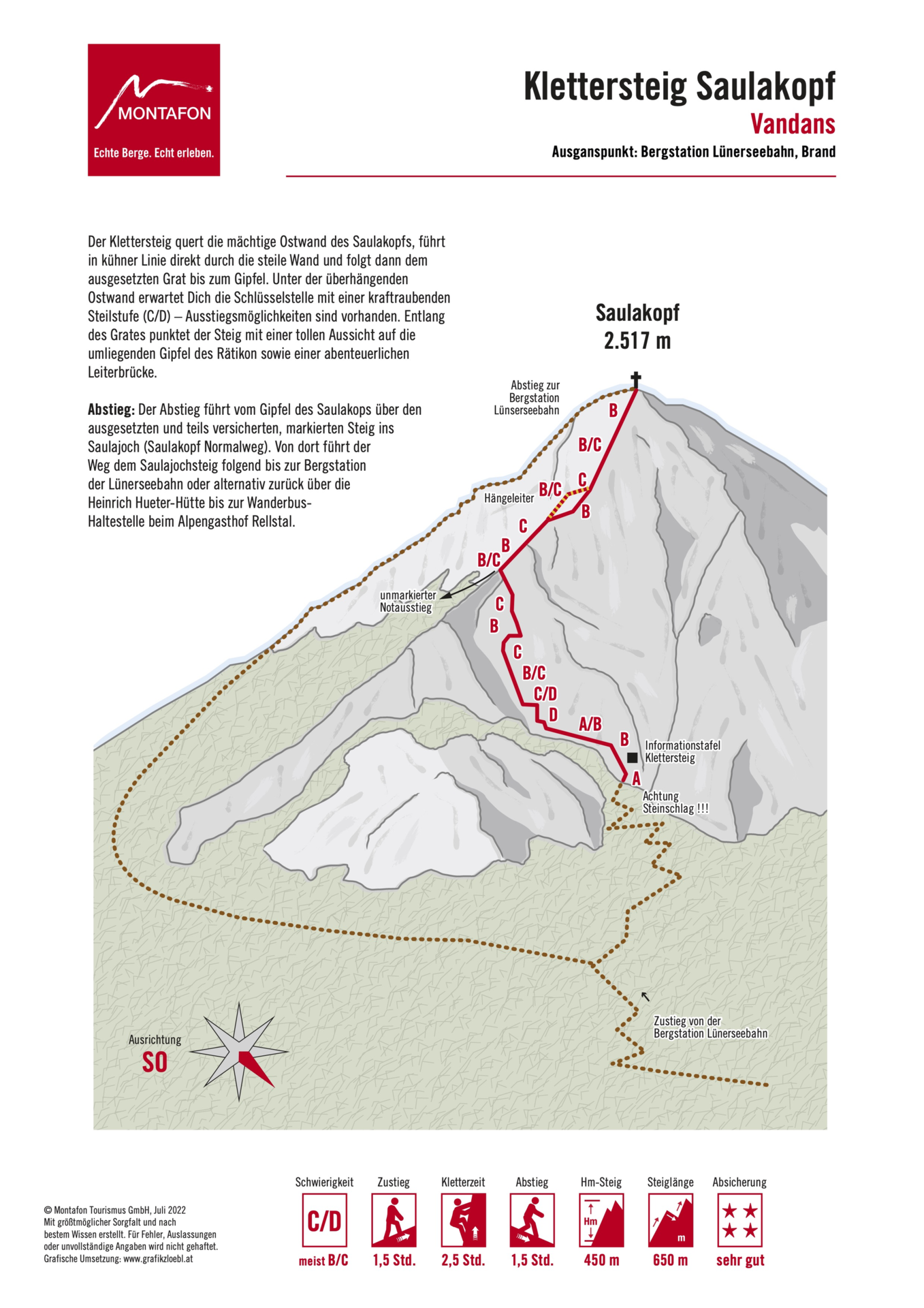 The via ferrata crosses the mighty east face of the Saulakopf, leads boldly directly through the steep wall, and then follows the exposed ridge to the summit. Under the overhanging east face, the key point awaits you with a strenuous steep section (C/D) – exit options are available. Along the ridge, the route scores with a great view of the surrounding Rätikon peaks as well as an adventurous ladder bridge.