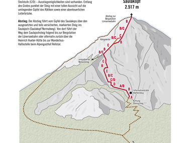Descent: The descent leads from the summit of the Saulakopf over the exposed and partly secured, marked path to the Saulajoch (Saulakopf normal route). From there, the path follows the Saulajoch trail to the mountain station of the Lünerseebahn or alternatively back via the Heinrich Hueter Hut to the hiking bus stop at the Rellstal alpine inn.