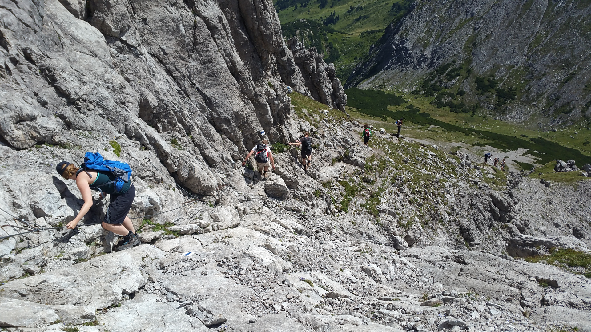 Approach: The fastest approach is from the Douglass Hut directly at the mountain station of the Lünerseebahn, from where you cross the dam and then descend slightly over the Saulajoch path to the Saulajoch. Now you follow the path further to the base of the Saulakopf east face. There a path branches off that leads you to the start. Beware of rockfall!