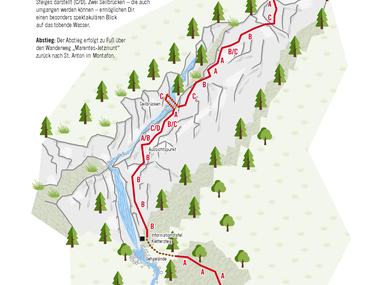 The descent is either directly back to the starting point or via the Marentes-Jetzmunt hiking trail to Vandans train station and back along the Ill river to St. Anton im Montafon.