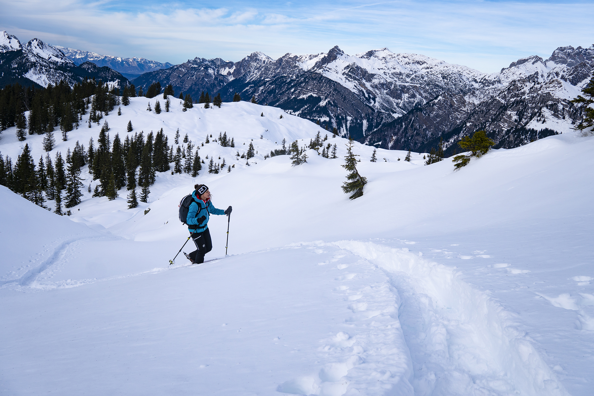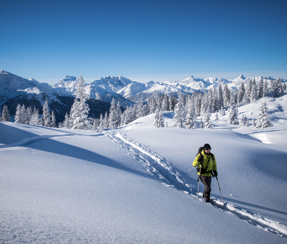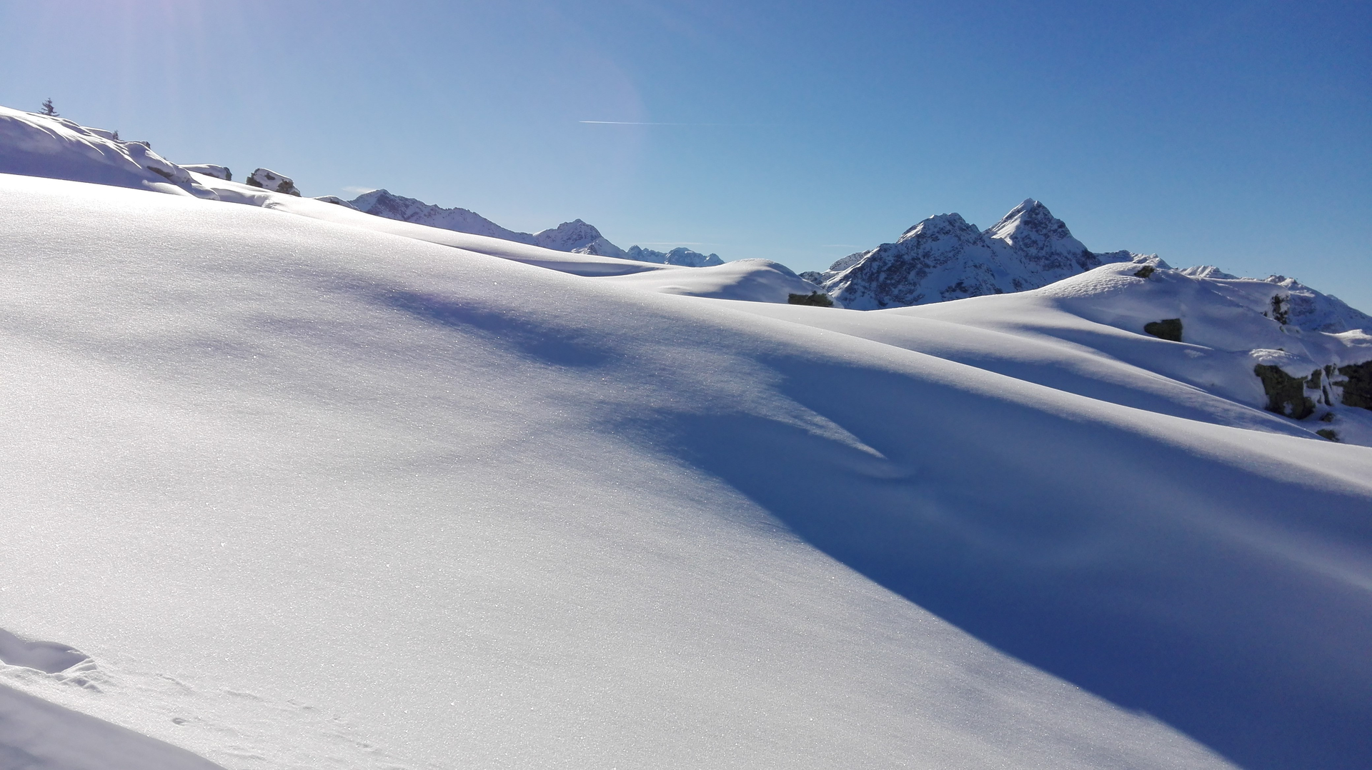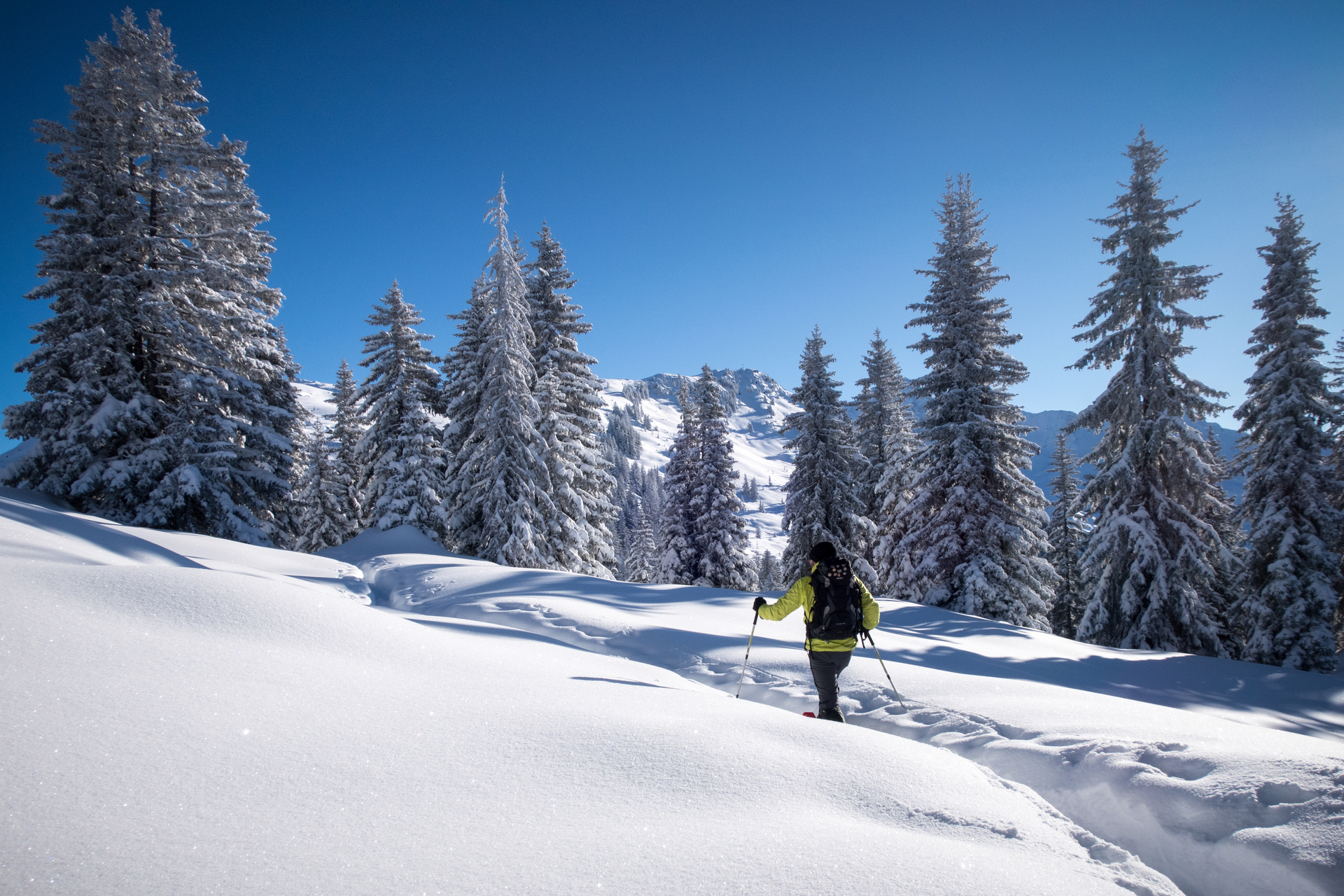 Snowshoes, telescopic poles with large baskets, avalanche equipment with transceiver, avalanche probe and shovel, day hiking backpack (approx. 30 liters) with rain cover possibly with avalanche airbag, comfortable and waterproof winter boots or sturdy hiking boots that fit into the snowshoe bindings, possibly gaiters, warm and durable clothing in layers, ski jacket and pants, hat/headband, scarf, gloves, possibly ski goggles, sun and rain protection, provisions and drinking water, thermos with hot drink, first aid kit, pocket knife, mobile phone, possibly headlamp and reflectors, maps, bivouac sack and rescue blanket