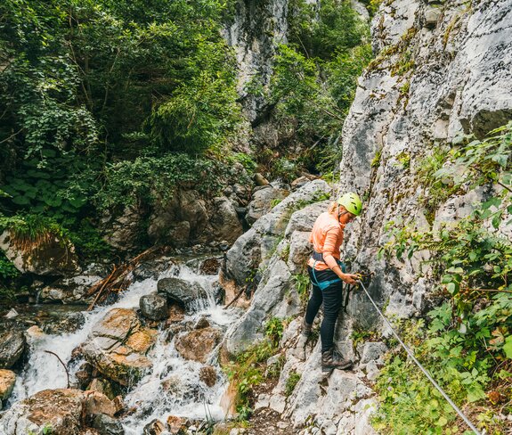Nach dem leichten Einstieg steigert sich das Niveau langsam und die ersten Kletterpassagen kommen. Wenn man diese gemeistert hat und sich warm geklettert hat, beginnt der eigentliche Klettersteig. Von jetzt an klettert man entlang der Steilwand der Schlucht. Für Anfänger - wie uns zwei - ist das schon sehr aufregend, denn unter einem sieht man nur das tobende Wasser des Flusses, der durch die Schlucht fließt. Auch wenn man nicht besonders hoch über dem Fluss ist, so ist abstürzen doch strengstens verboten. Der Klettersteig lässt sich aber auch für Anfänger ohne Probleme klettern und es gibt nur wenige schwierige Stellen. Die meisten Schwierigkeiten birgt der nasse Fels auf dem man hin und wieder nur schlecht halt findet. Deshalb empfiehlt es sich feste Schuhe mit gutem Profil anzuziehen.