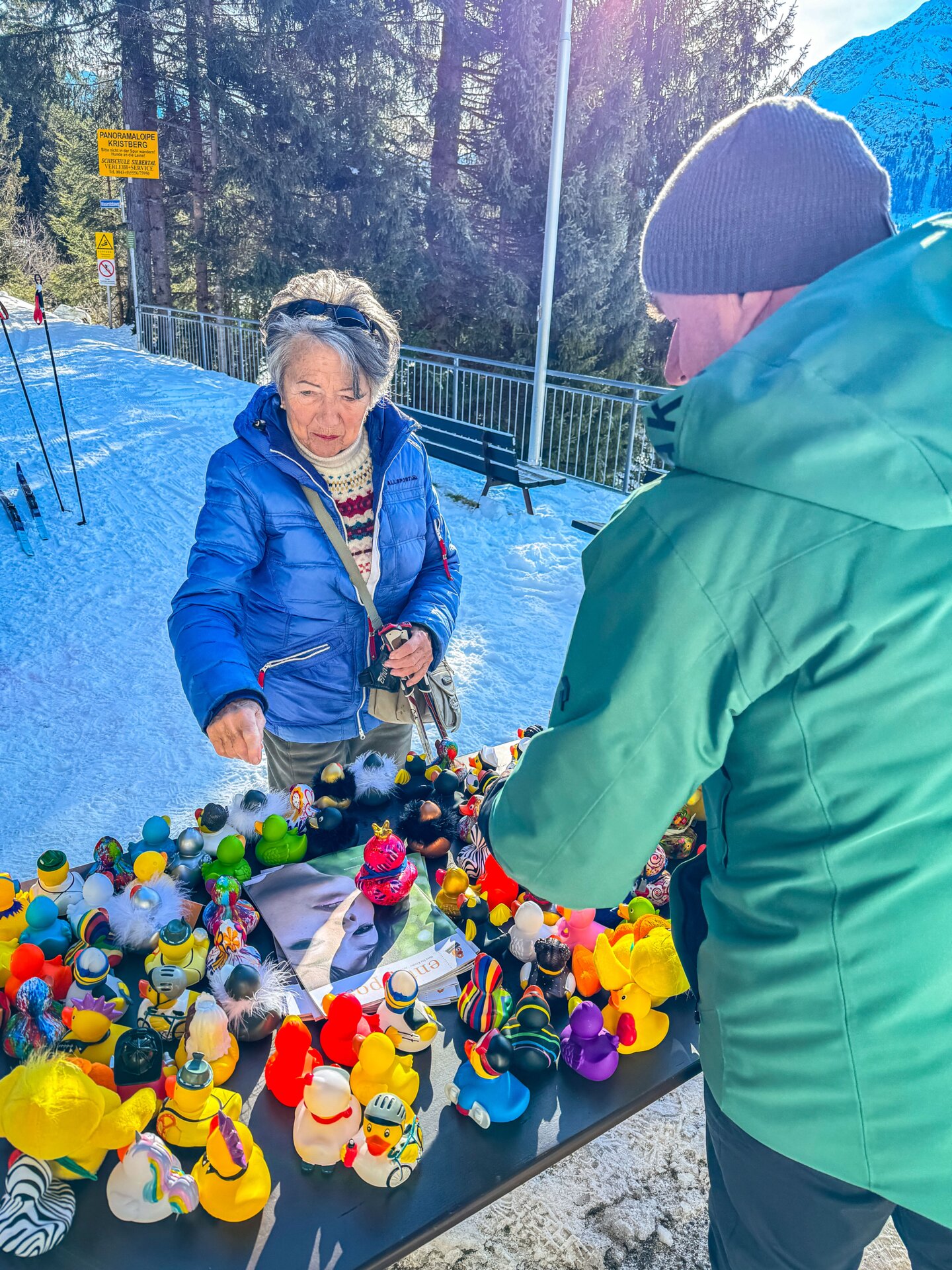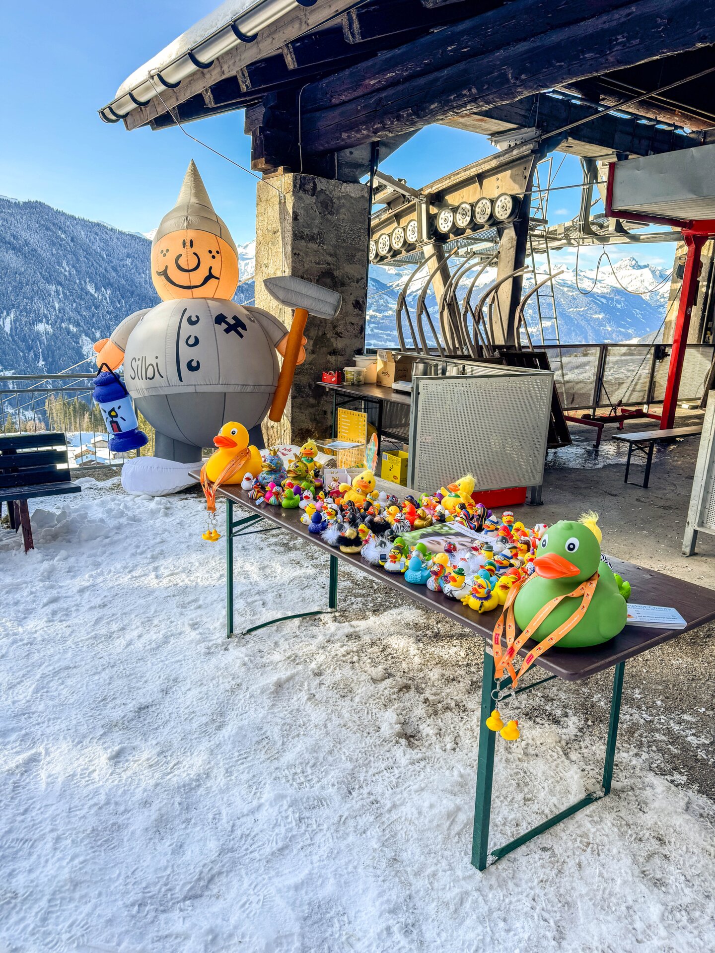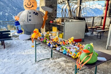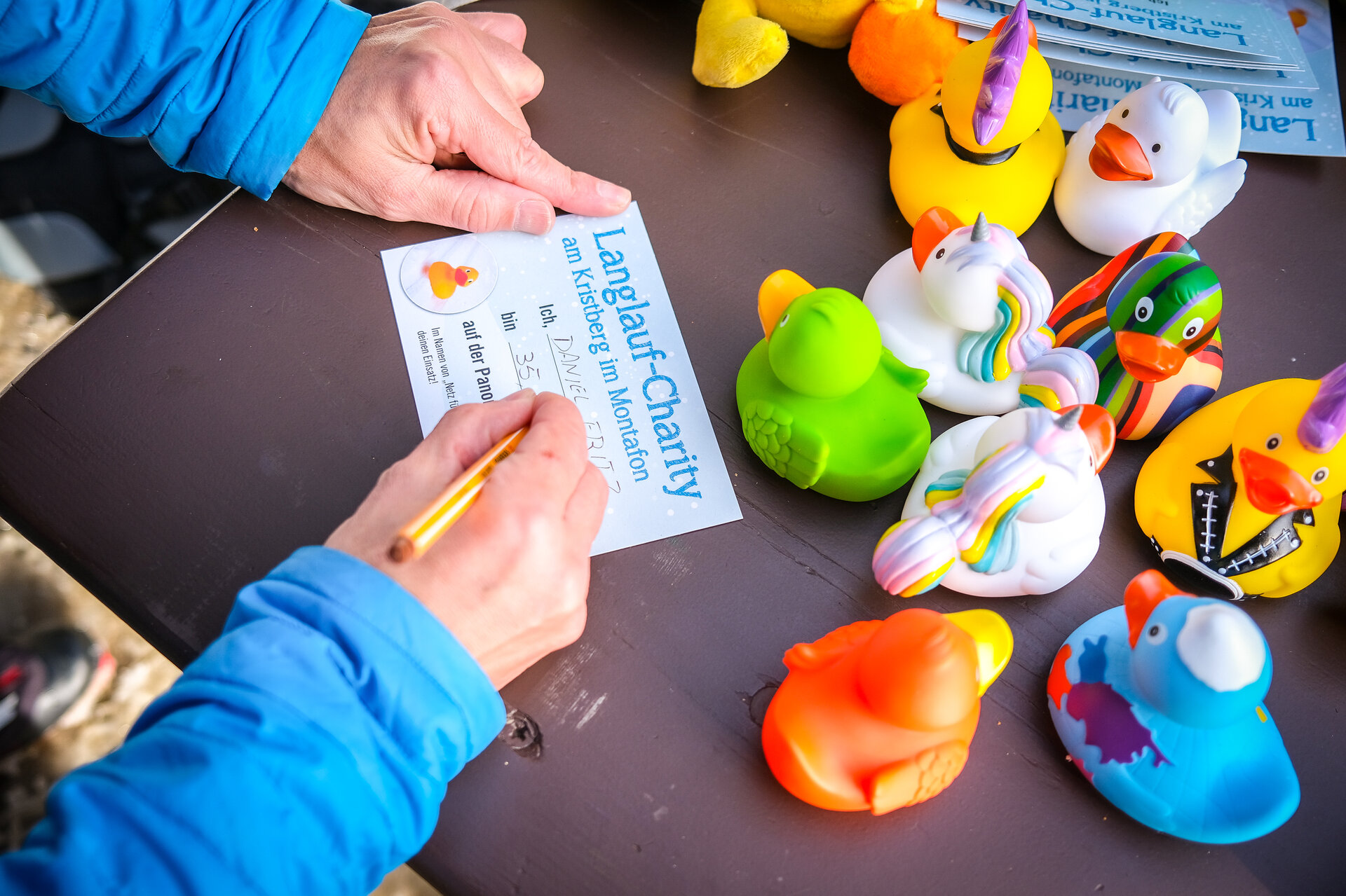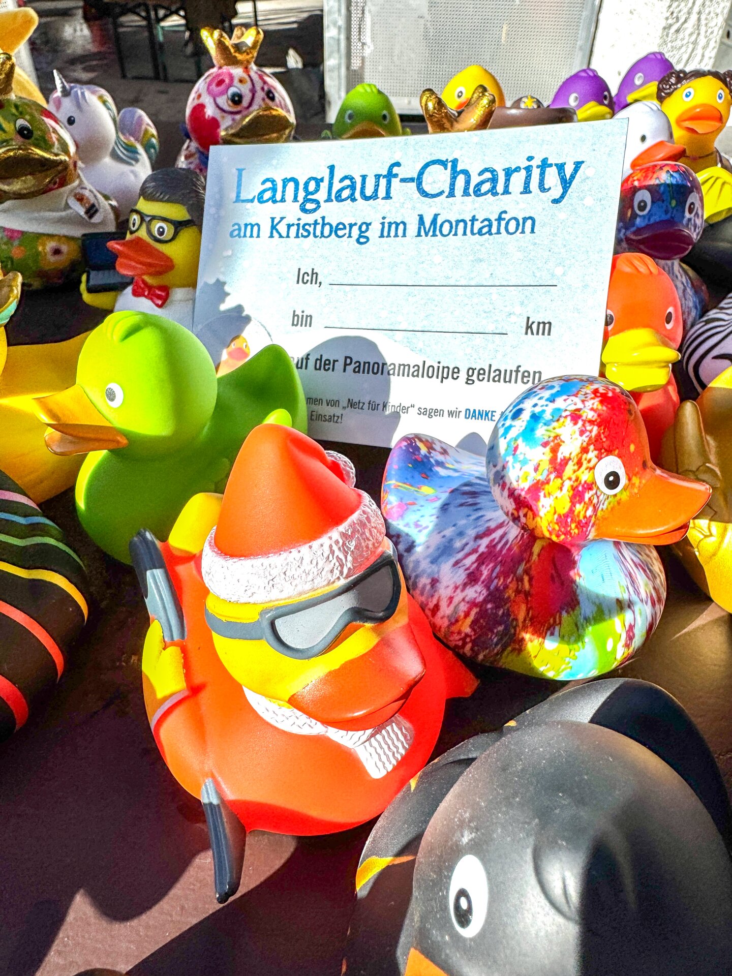 Bei der Bergstation der Montafoner Kristbergbahn war das Team vom „Netz für Kinder“ und Jürgen Zudrell stationiert. Hier gab es neben der "kostenfreien" Langlaufausrüstung auch verschiedene Tee´s, Säfte, Wasser und jede Menge bunte "Enten", das Symbol vom „Netz für Kinder“ (Ente gut alles gut :)).