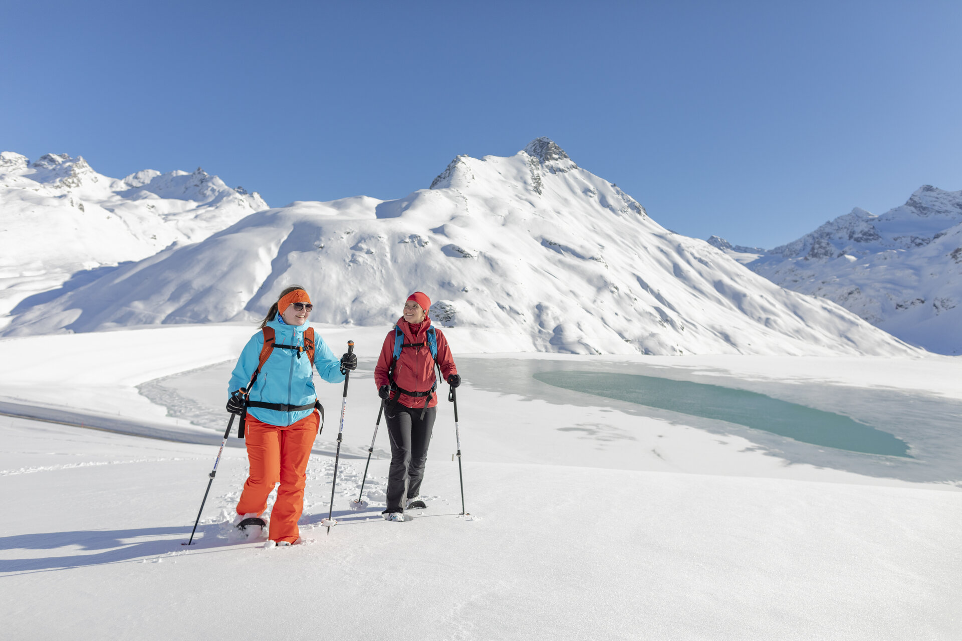 Jetzt, wo der Winter allmählich das Feld räumt und dem Frühling weicht, sehnen sich unsere müden Ski-Beine nach etwas Leichtfüßigkeit. Deshalb habe ich heute mal die klobigen Skischuhe zu Hause gelassen und gegen federleichte, Bärentatzen-ähnliche Schneeschuhe getauscht. Im Montafon gibt es zahlreiche Schneeschuhwanderwege, die erkundet werden möchten, um die teils unberührte schneebedeckte Landschaft zu bestaunen. Ich entschied mich aufgrund der vielversprechenden (fast sommerlichen) Verhältnisse für eine geführte Schneeschuhwanderung zum Silvrettasee.