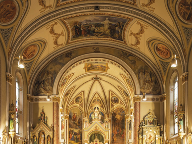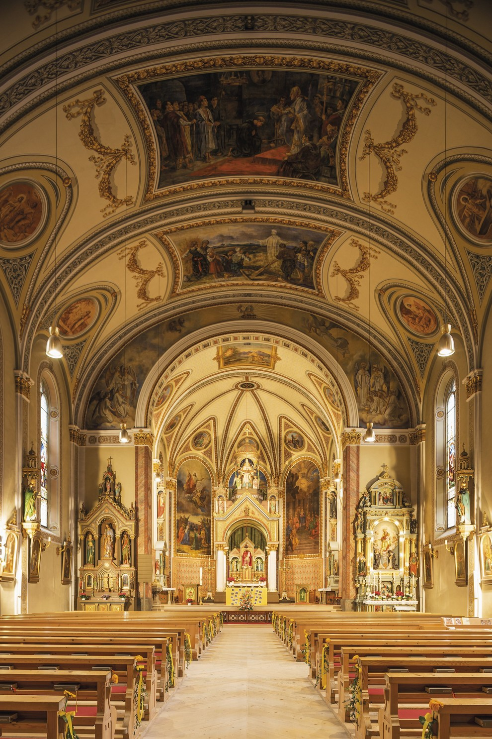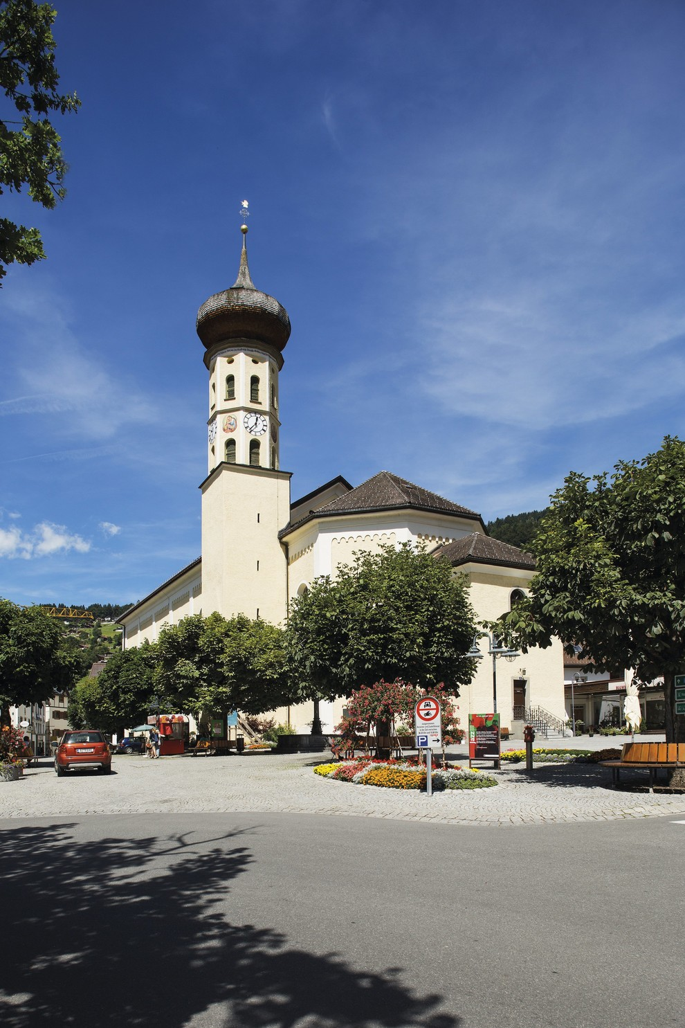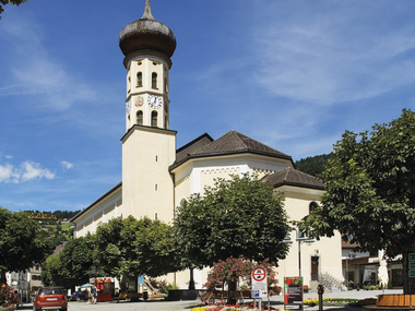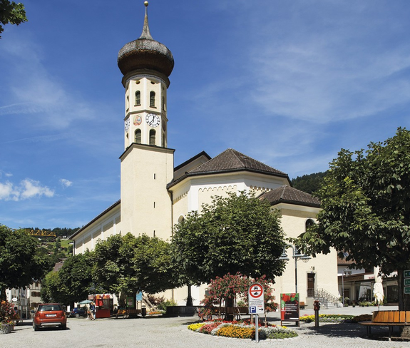 The church was built in 1865. It houses neo-Roman altars, paintings in the Nazarene style as well as numerous paintings (on both sides of the high altar, on the choir ceiling) by Franz and Jacob Bertle from the Bertle family of painters in Schruns. Hans Bertle (son of Jakob Bertle) created five ceiling paintings in the nave and the medallions above the windows. The carpenter Anton Bertle and the sculptor Ignaz Bertle are responsible for the design of the pulpit.